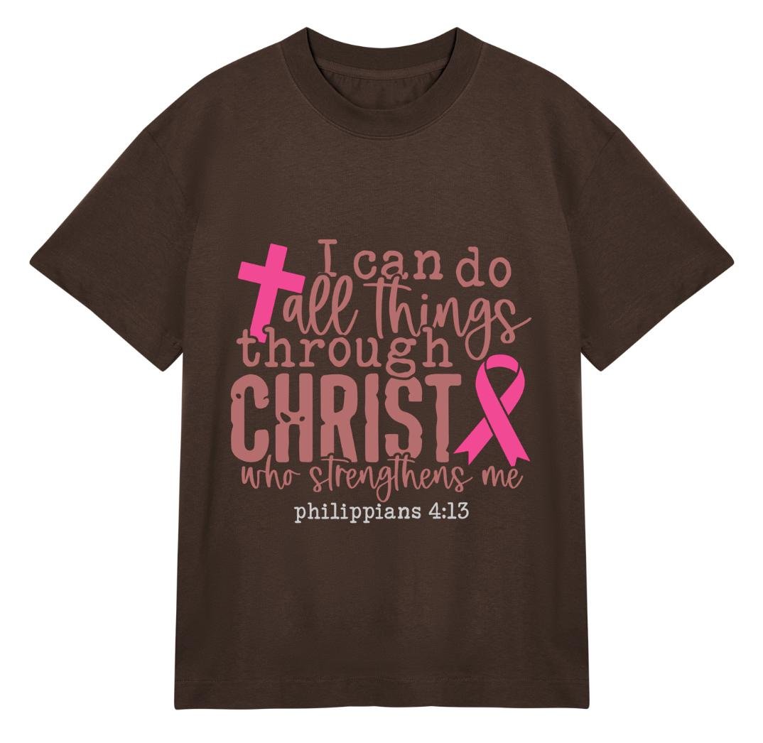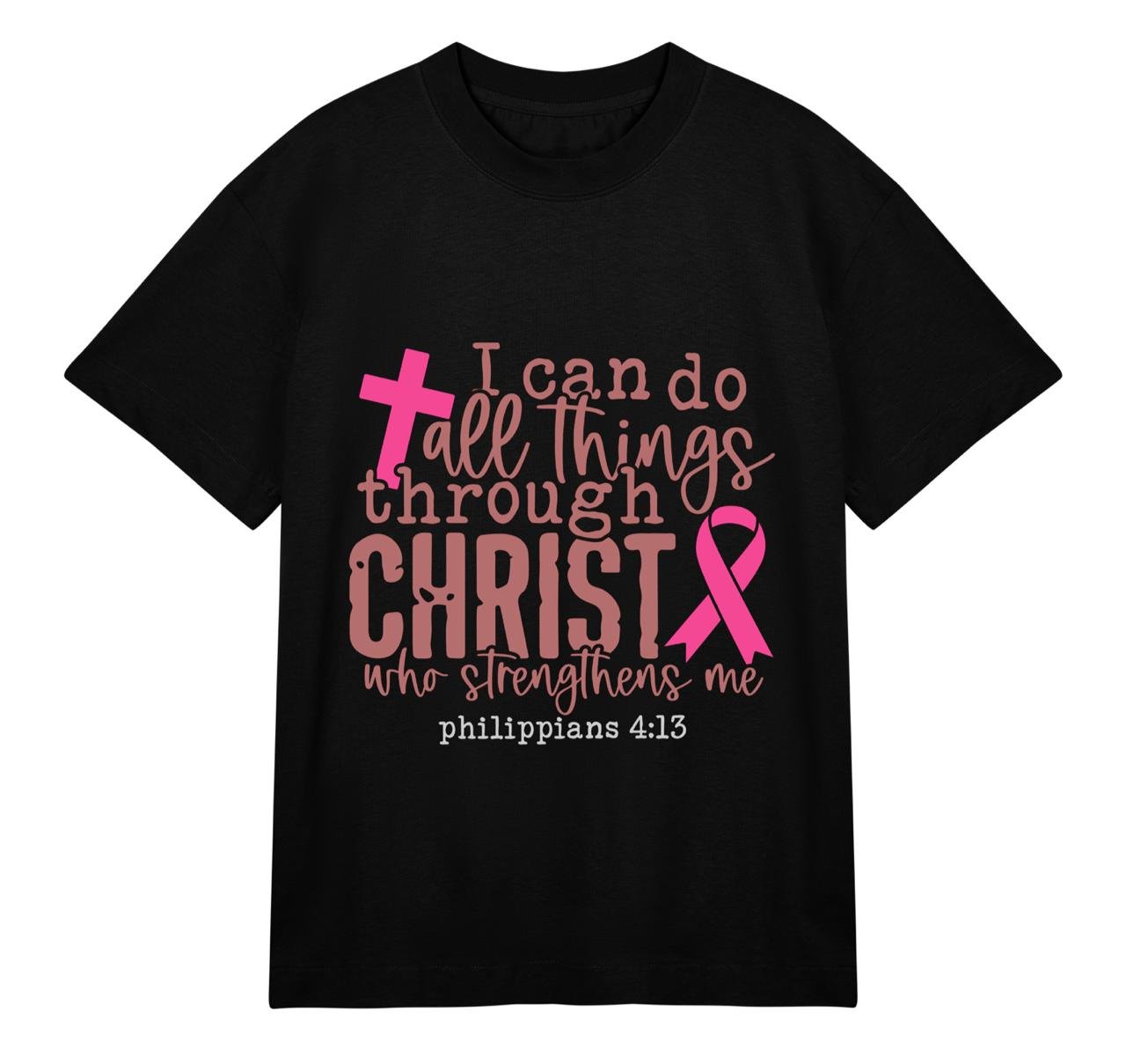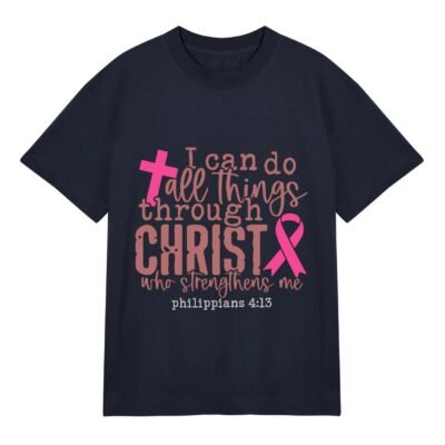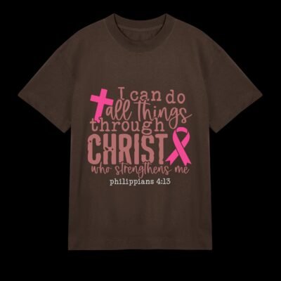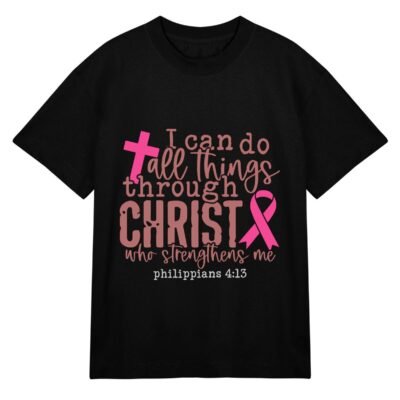 This 100% cotton t-shirt is more than just apparel, it’s a declaration of inner power and belief. Featuring a beautifully printed verse from Philippians 4:13, it reminds you that strength comes from within and above. The soft, breathable fabric ensures all-day comfort, while the elegant design highlighted by a symbolic cross and awareness ribbon speaks to resilience, hope, and grace.