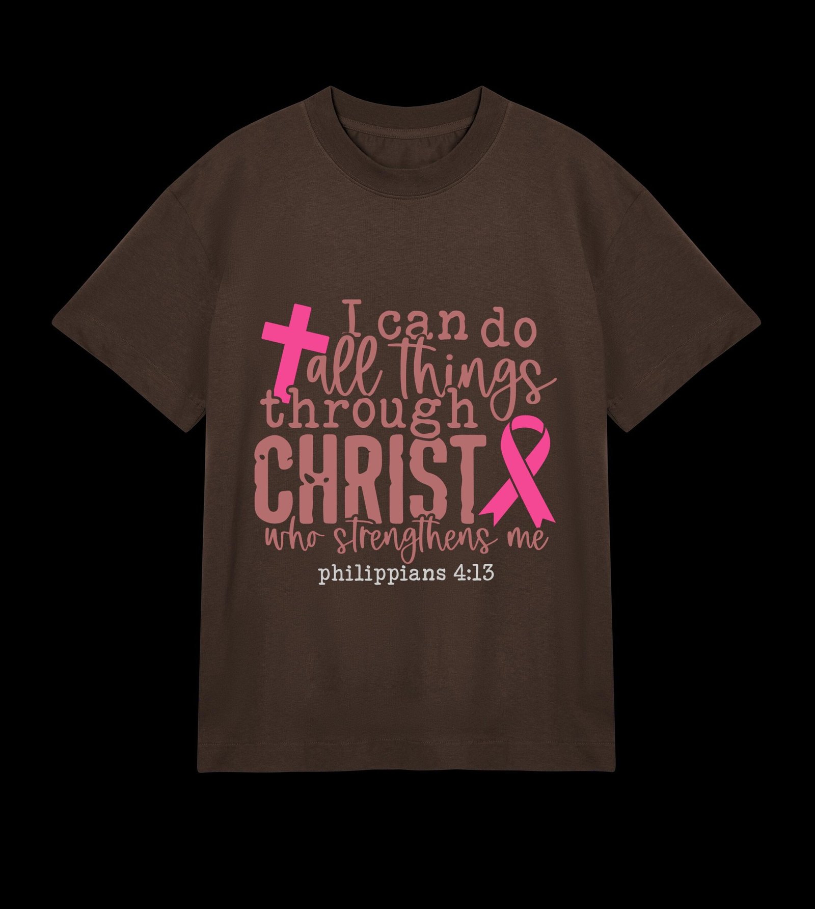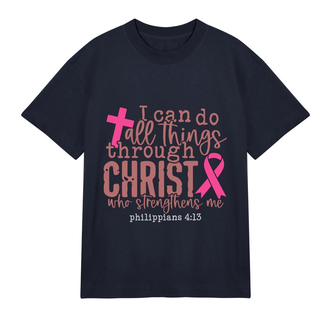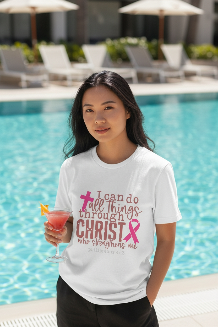 This 100% cotton t-shirt is more than just apparel, it’s a declaration of inner power and belief. Featuring a beautifully printed verse from Philippians 4:13, it reminds you that strength comes from within and above. The soft, breathable fabric ensures all-day comfort, while the elegant design highlighted by a symbolic cross and awareness ribbon speaks to resilience, hope, and grace.